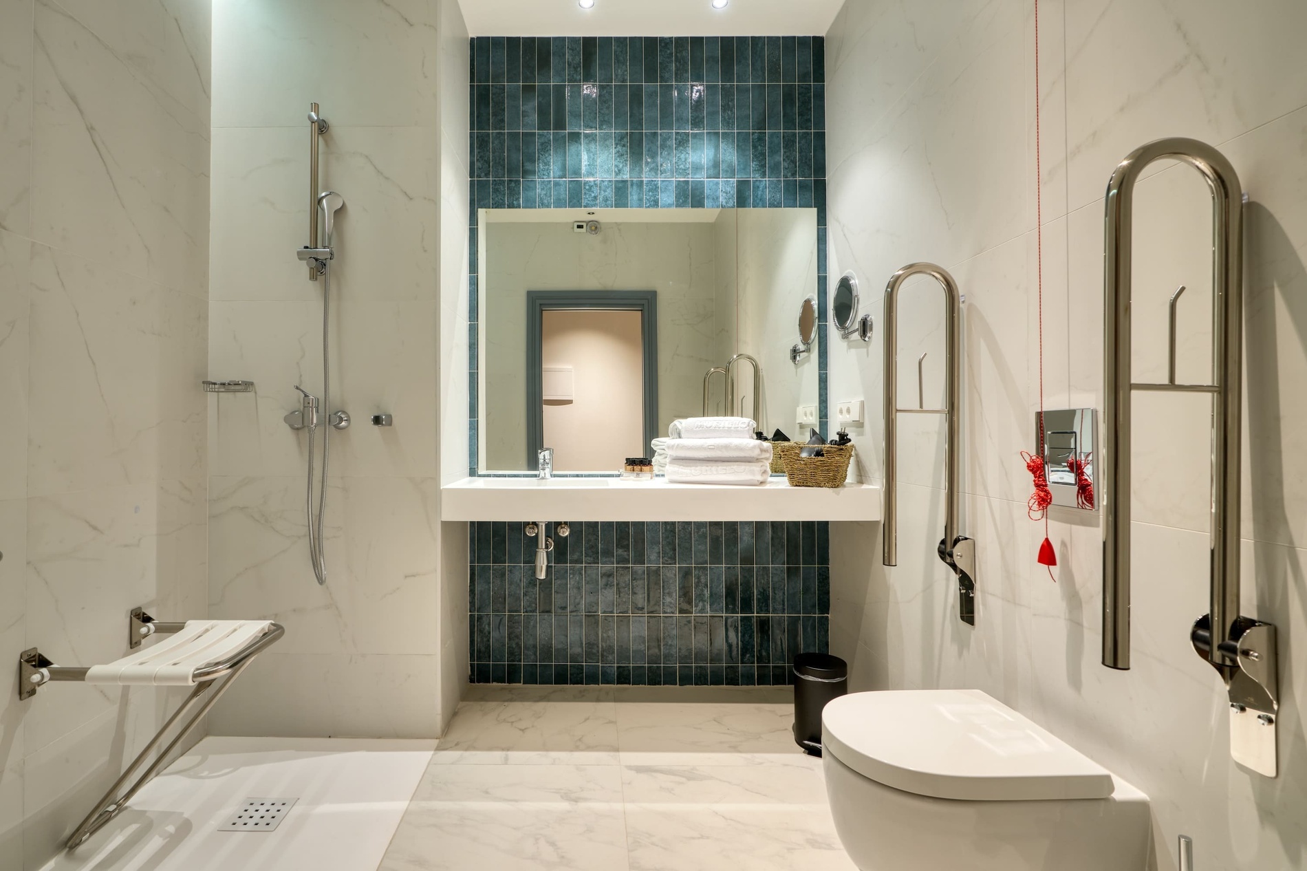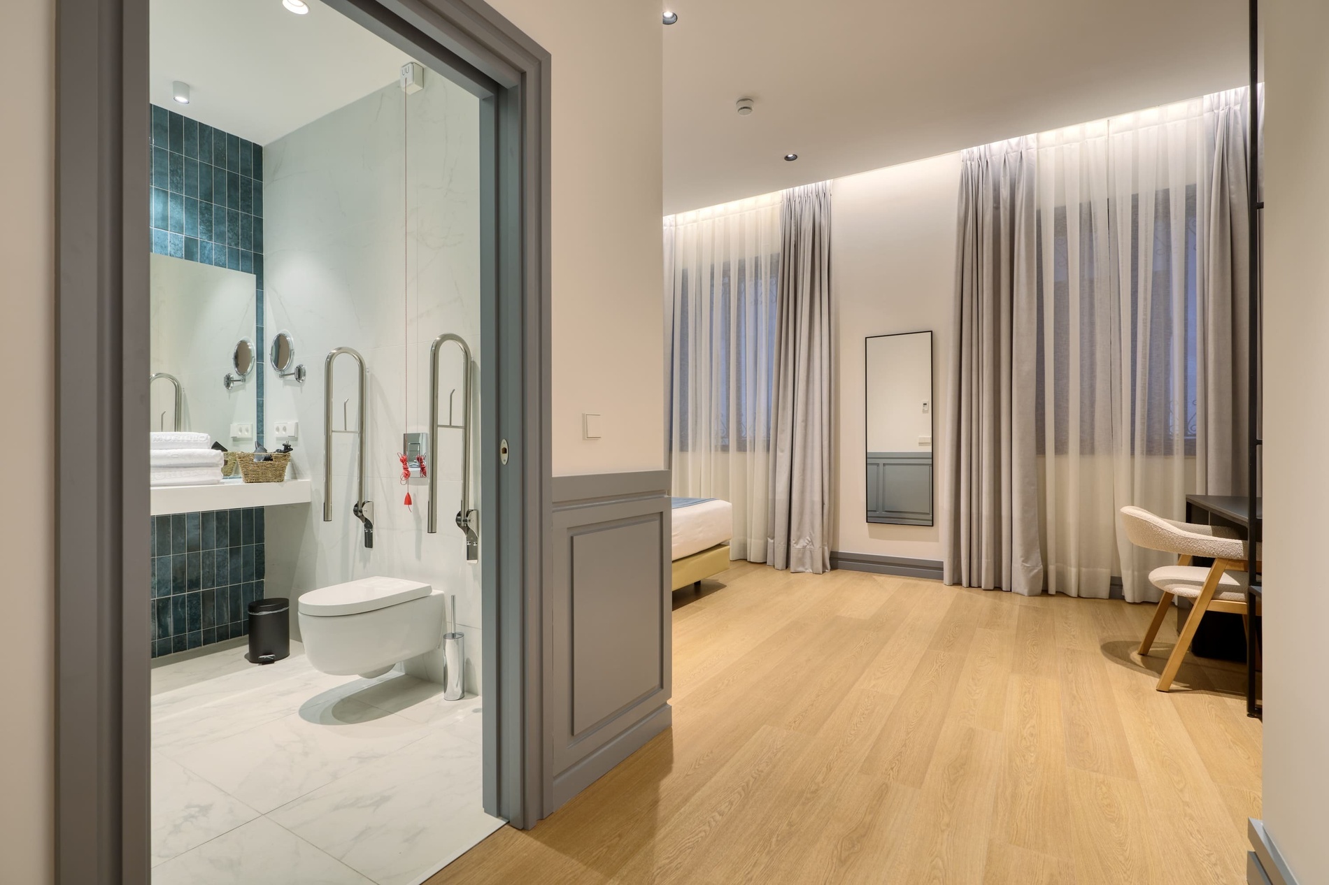Para personas con movilidad reducida, disponemos de una habitación especialmente adaptada. Esta, al igual que las habitaciones comunicadas, puede reservarse exclusivamente a través de nuestro equipo de recepción.